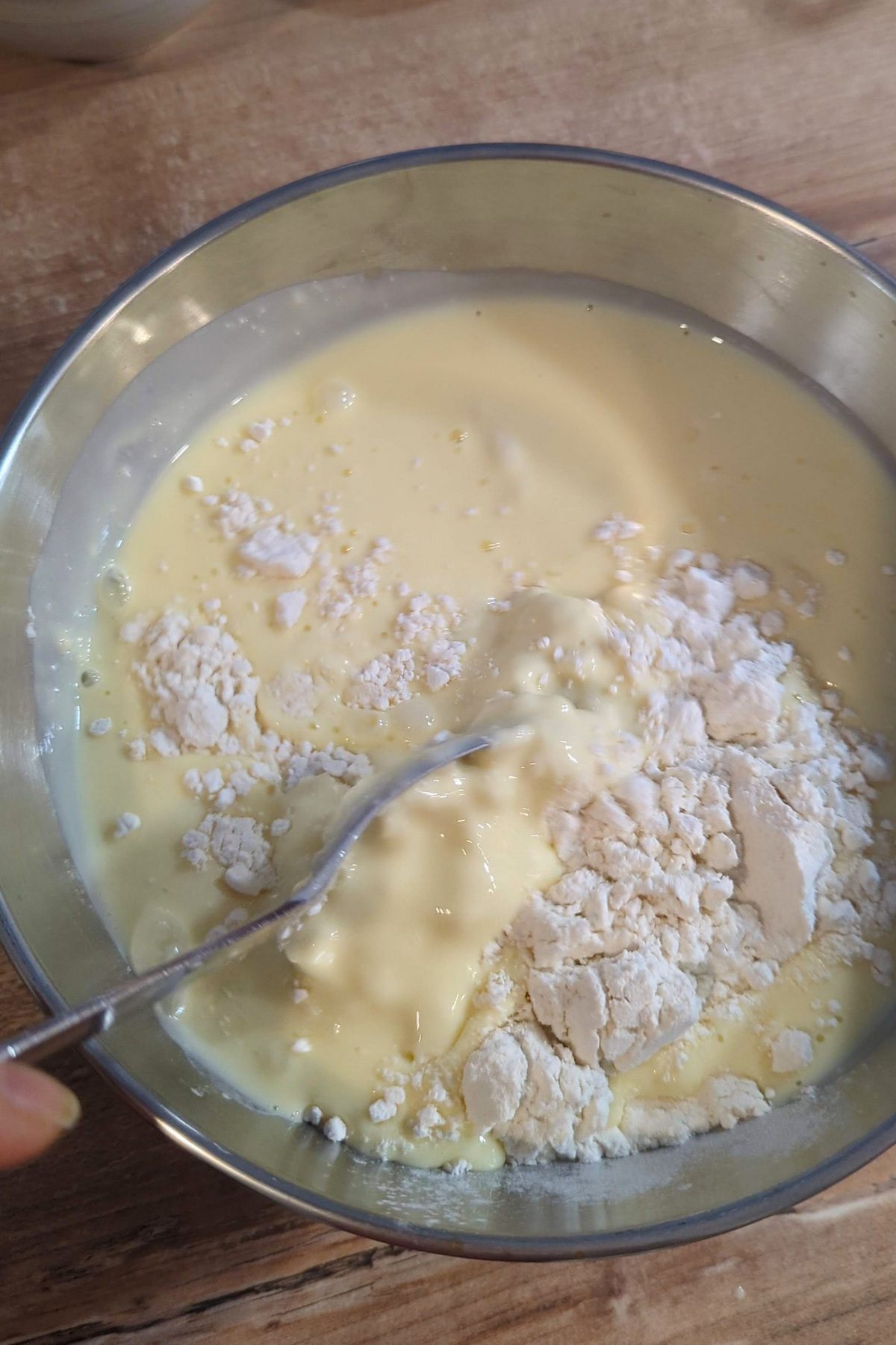 - Wichtig! Den Teig sofort gut durchmischen, denn dieser Teig darf später nicht mehr gerührt werden, das würde der Konsistenz schaden.