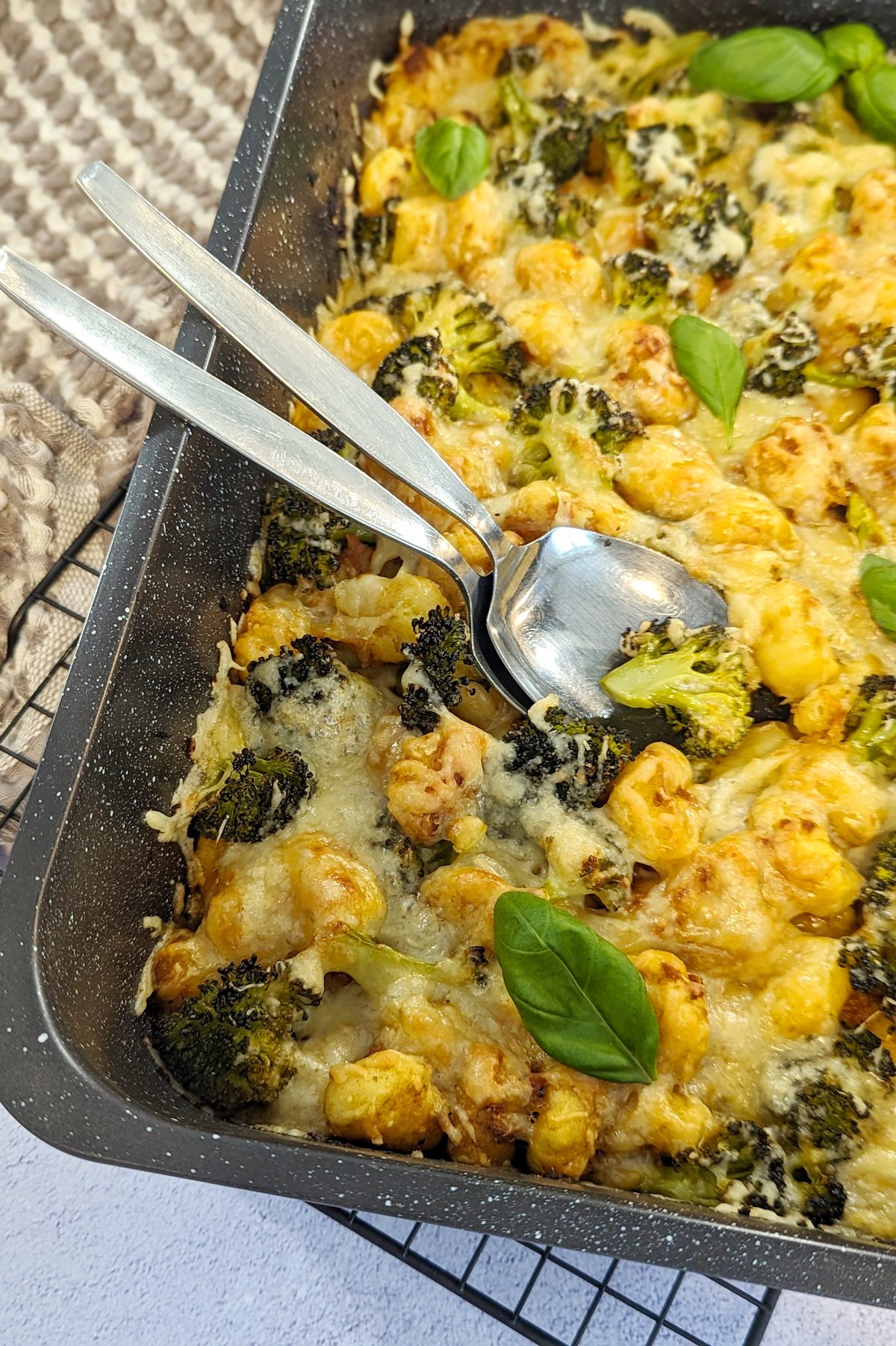 - Achte darauf, den Brokkoli gleichmäßig über die Gnocchi zu verteilen, damit alles gleichmäßig gart.
